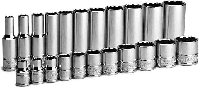 Capri Tools high performance sockets are trusted by professionals for even the most demanding applications. We use premium Chrome Vanadium steel tempered with our proprietary heat treatment process to make these sockets and drivers. They are durable and withstand more torque. Each socket underwent careful polishing and protective plating process to achieve our own MaxChrome finish. The 12-point WaveDrive design grips fasteners more tightly than traditional design, preventing fastener rounding and giving you more leverage. 22-piece set includes (11) 3/8 in. drive 12-point deep sockets: 1/4, 5/16, 3/8, 7/16, 1/2, 9/16, 5/8, 11/16, 3/4, 13/16, 7/8 in., (11) 3/8 in. drive 12-point shallow sockets: 1/4, 5/16, 3/8, 7/16, 1/2, 9/16, 5/8, 11/16, 3/4, 13/16, 7/8 in.