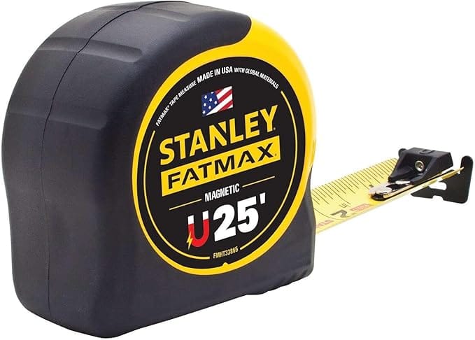 The Stanley FMHT33865S fatmax 25 ft magnetic tape measure has a powerful magnet that holds the tape in place when working with metal such as pipes, steel beams, ducts, and more. It is an especially convenient solution for electricians, plumbers, machine shop workers, steel framers and general contractors. This tape features an 11′ blade standout* for reach and ease of use, with blade Armor coating that extends blade life up to 10 times longer than a basic Stanley tape measure. It has a three-rivet, corrosion-resistant end hook for accurate measurements; this Tru-Zero magnetic hook measures accurate every time. The slidelock feature holds blade securely in position, with 16″ and 19.2″ stud center markings that simplify framing jobs. Backed by Stanley limited lifetime warranty.