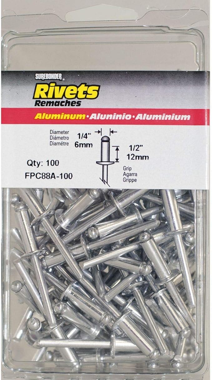 Surebonder FPC88A-100 Long Aluminum Rivets – 1/4″ Diameter, 1/2″ Grip – 100 count. 1/4 Size. 1/2 Length. Aluminum. 100 Per Box.