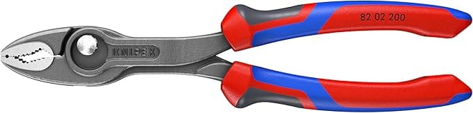 KNIPEX TwinGrip 82 02 200 with comfort grip handles. Unique combination of front and side gripping. Front jaw design grips stripped screws. Optimized side jaw with opposing teeth for maximum force. Side gripping jaws for round, square and hex materials. The only 5 adjustment push-button slip joint pliers in the market. Gripping capacity for diameters and widths across the flats from 5/32″ to 7/8″ (4 to 22 mm). Reliable gripping of flat workpieces due to the three-point system. Box joint design for added tool stability. Slim head design for working in confined spaces. Pinch guard prevents operators’ fingers being pinched. Gripping surfaces with special hardened teeth, teeth hardness (approx. 61 HRC). Forged from high-grade chrome vanadium electric steel; oil-hardened.
